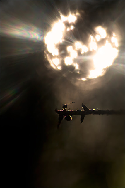 En liten myra. Jag vill kunna visa att en den har ett liv. Åååh, vad jag vill fånga hans personlighet på bild, herregud, kan man fånga en människas personlighet kan man väl fånga en myras? Tänk om jag skulle svara den där grannen det? Eller den på jobbet som undrar vad jag fotat i helgen och då vad? Kanske jag ska svara så nästa gång? - att jag försöker hitta myrans personlighet och fånga den på bild, för att visa att den är ett underbart klokt litet liv :o) ja, tja..., jo, jag ser redan hur man skakar på huvudet åt mitt svar, fast att det ännu bara vilar i mitt huvud.